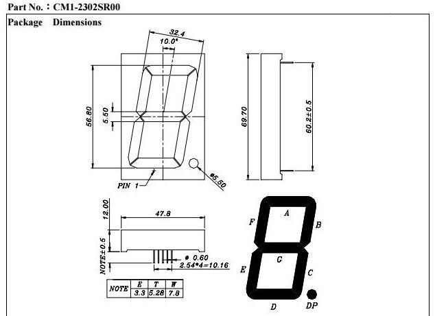 Die Modulmaße sind 69,7 mm x 47,8 mm, die Ziffernhöhe ist 56,8 mm ( 2,3" ).
