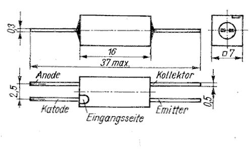 GaAs-LED und NPN-Fototransistor. LED: If = 100 mA, Ur = 3 V-, Fototransistor: Uce = 35 V-, Uec = 5 V-, Ptot = 200 mW